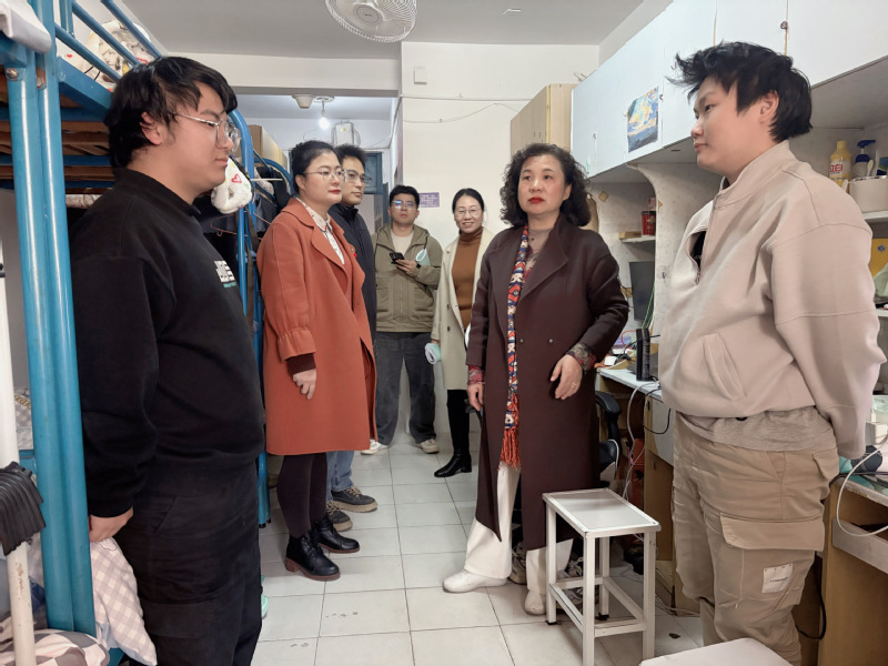 走访过程中,王莉娟书记先后深入各年级学生宿舍,与同学们面对面亲切交流。在宿舍内,领导老师们仔细查看了同学们的住宿条件,包括环境卫生、设施设备运行情况等,详细询问大家的学习进度、生活困扰以及未来规划。针对大一新生普遍存在的适应问题,王莉娟耐心倾听他们的心声,鼓励新生们尽快转变角色,主动融入大学生活,充分利用学院资源提升自我;对于高年级学生,她则重点关注其专业学习与就业准备情况,结合学院学科优势给出针对性建议,叮嘱大家树立明确目标,为未来发展夯实基础。
